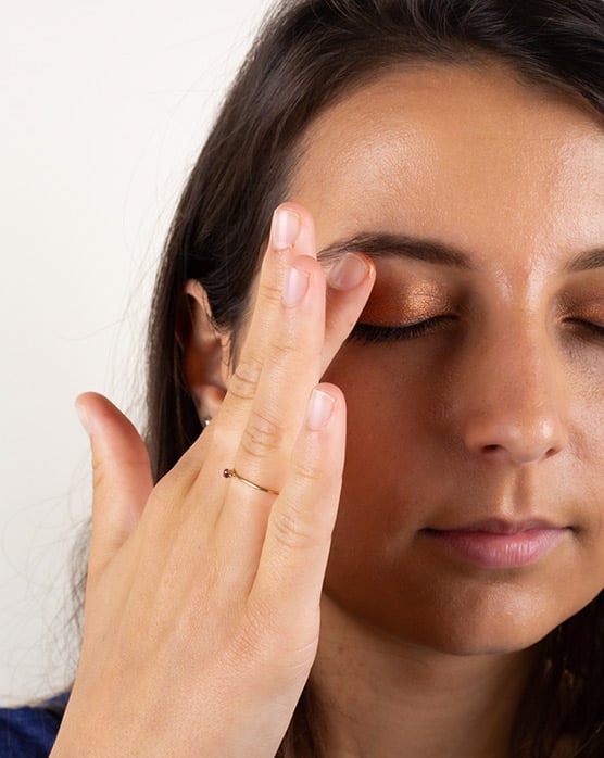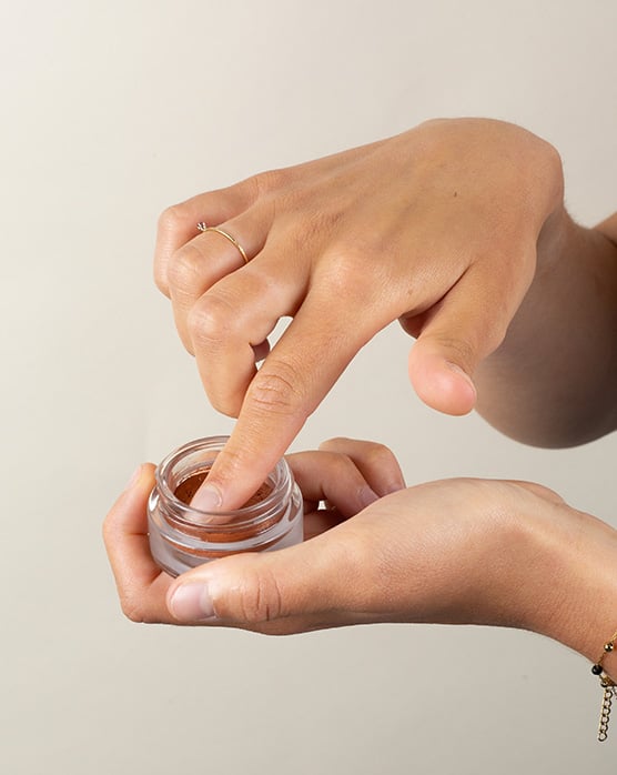 Both options are available: finger-applied for a more generous, natural application, and brush-applied for a more precise application. For use with a brush we recommend a finer, flat brush, which is better suited to the travel size of our jar. You can then use a blending brush to blend the color.